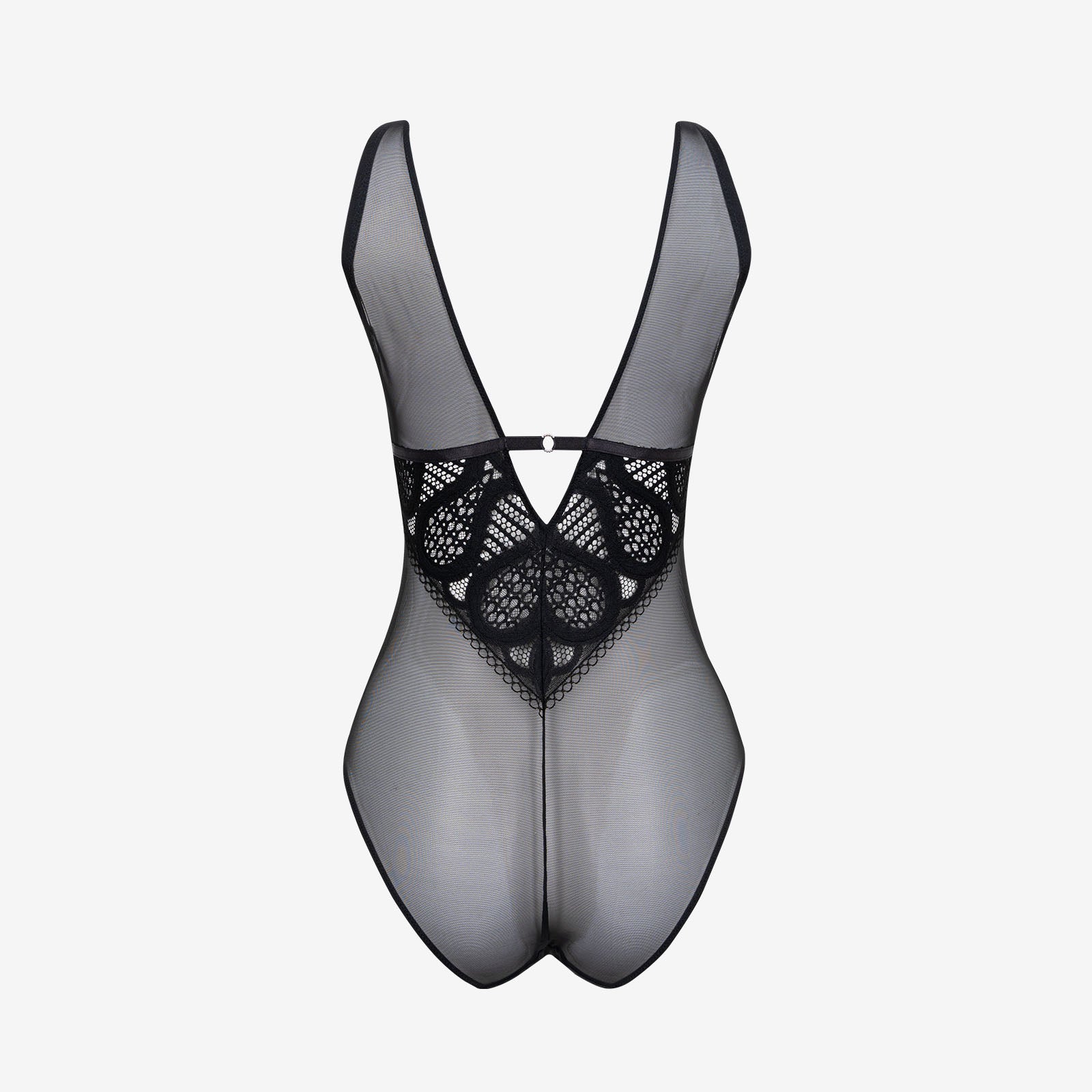 Le graphisme affirmé de la dentelle crée un effet visuel saisissant. Chaque modèle dévoile une dentelle noire au design travaillé, mêlant courbes sinueuses, formes ogivales et fonds alvéolés pour un rendu hypnotique et envoûtant. Le décolleté droit, aérien et léger, ajoute une touche de finesse et souligne l’élégance contemporaine de la ligne. Pièce emblématique de la collection, le body se distingue par sa coupe ultra-sexy, qui sublime les courbes et joue avec les transparences, sans jamais tout dévoiler.