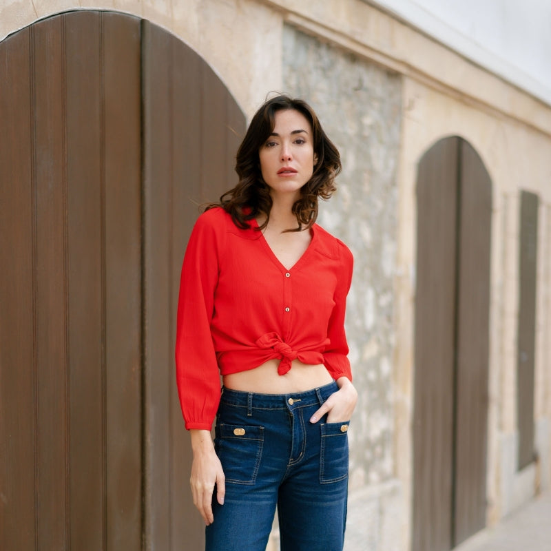 La chemise Roxane au coloris rouge vif allie confort et style grâce à son tissu stretch gaufré, offrant une liberté de mouvement tout en étant agréable à porter.