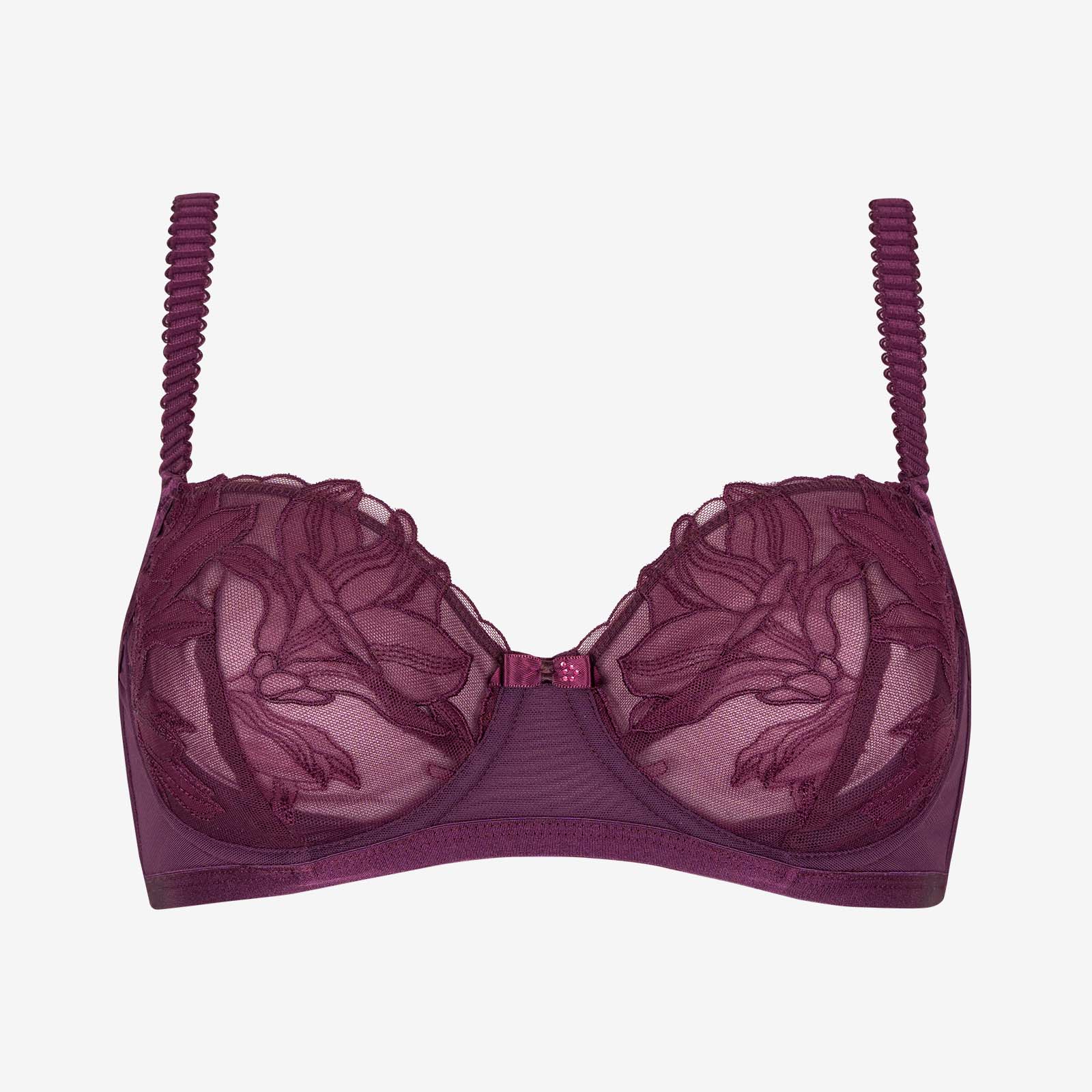 Ce sublime coloris Lie de Vin, signature de la ligne, s’allie à la délicatesse de la broderie florale et à la légèreté du tulle pour dessiner une silhouette à la fois sensuelle et élégante. Les élastiques brillants soulignent les courbes et structurent les formes avec une touche graphique et contemporaine.