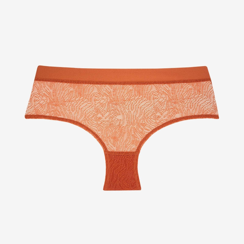 Chaque pièce de la collection « Indiana » est un hymne à la modernité, une symphonie de lignes fluides et de coupes innovantes qui célèbrent la diversité et la beauté du corps féminin. Cette ligne, marie avec audace la sensualité de la dentelle zébrée à la chaleur envoûtante de la couleur terracotta.