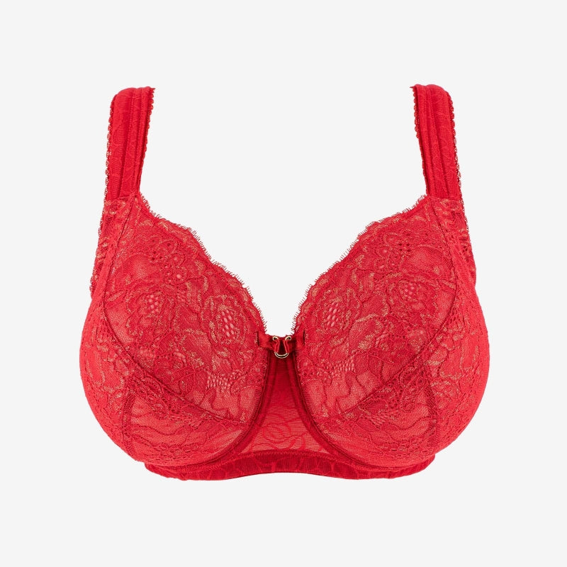 Cette collection sublime la féminité avec une dentelle florale ornée de fils brillants dorés et un tulle fantaisie, le tout rehaussé par sa teinte passionnée : un beau rouge flamboyant. Elle est conçue pour vous faire briller de mille feux ! La pièce maîtresse de la ligne est un bustier très habillé, conçu pour magnifier la silhouette avec une élégance sans pareille. Il offre un maintien parfait et une allure sophistiquée. Idéal pour des occasions spéciales ou pour se sentir extraordinairement belle au quotidien, il est la pièce incontournable de votre garde-robe.